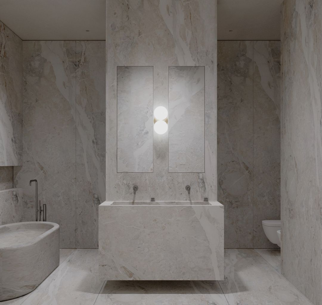 мрамором Pietra Grey, установлен санфаянс Gessie и Villeroy&Boch.